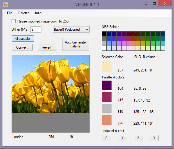 Hey, I made an app this week. It can convert an image into a 4 color NES palette image. It can also save as CHR and do different levels of dithering. It runs on Windows computers. It should run on non-Windows computers with MONO.