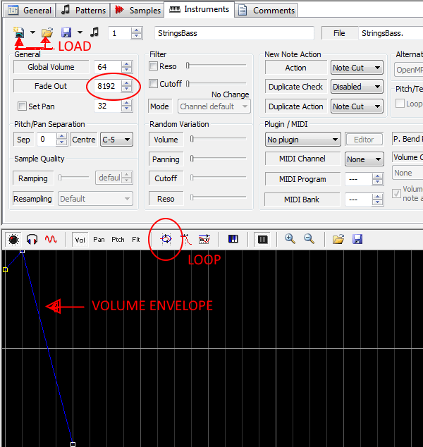An important note. If you want a sustained note, you will probably want to click the envelope LOOP button. If the LOOP button isn’t checked, and if the volume envelope doesn’t go down to zero at the end, once it reaches the last dot on the envelope, it will use the “Fade Out” value to slowly fade out the instrument. Higher = faster fade out, Lower = slower fade out. The picture below, the envelope DOES go down to zero, so there is no need for the fade out value… but if the last dot was in the middle, it would start to slowly fade out at that point.