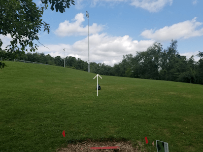 Hole 17 – is a steep uphill, with OB along the right. From the red tee, try a big hyzer shot to the right of those trees. From the white and blue tees, you could go between the trees with an understable disc.