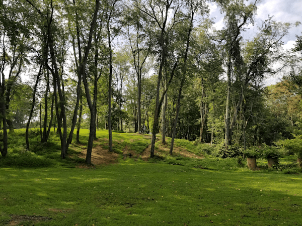 Monroeville DGC is a mixture of wooded and open holes. It’s very hilly. The only water is a creek that runs from the right of hole #1, crosses in front of the white tees on #2, and then goes along the far right side of #2 fairway. The tees are marked by a painted plank of wood and some flags (and a pile of mulch). There is one bathroom by the #1 tees.
