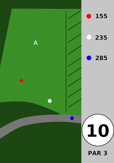 From the white tees it’s 200 ft to clear the tree on the right and 240 ft to the hill. The arrow here will get you to the center of the fairway. You could also land on the hill, by the fence.