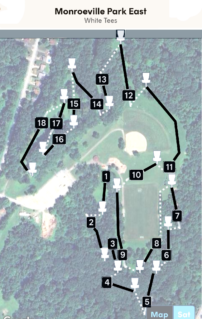 Monroeville DGC is a mixture of wooded and open holes. It’s very hilly. The only water is a creek that runs from the right of hole #1, crosses in front of the white tees on #2, and then goes along the far right side of #2 fairway. There is one bathroom by the #1 tees (not open during the winter).
